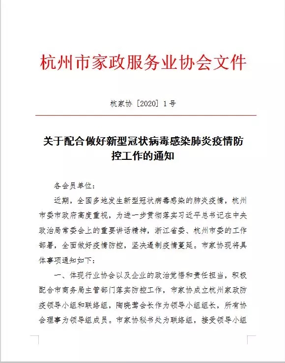 杭州市家協(xié)于1月28日成立了杭州家政防疫領(lǐng)導(dǎo)小組和聯(lián)絡(luò)組,積極配合市商務(wù)局主管部門落實防控工作,并要求會員企業(yè)做好健康情況自查統(tǒng)計。