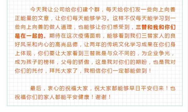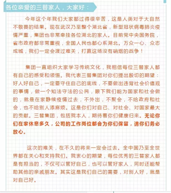 浙江省家協(xié)、杭州市家協(xié)會長單位,三替集團在1月26日就表示暫停所有的上門服務(wù),已經(jīng)接入的客戶訂單由客服人員進行宣傳告知,全部取消。除此之外,陶曉鶯會長給遠(yuǎn)在湖北的員工們寫了一封家書,向員工承諾,集團嚴(yán)格遵守中央和省委的政策,讓員工安心在家休息,靜候疫情過去,并為員工保留工作崗位,這也是給全省的家政企業(yè)樹立了榜樣。