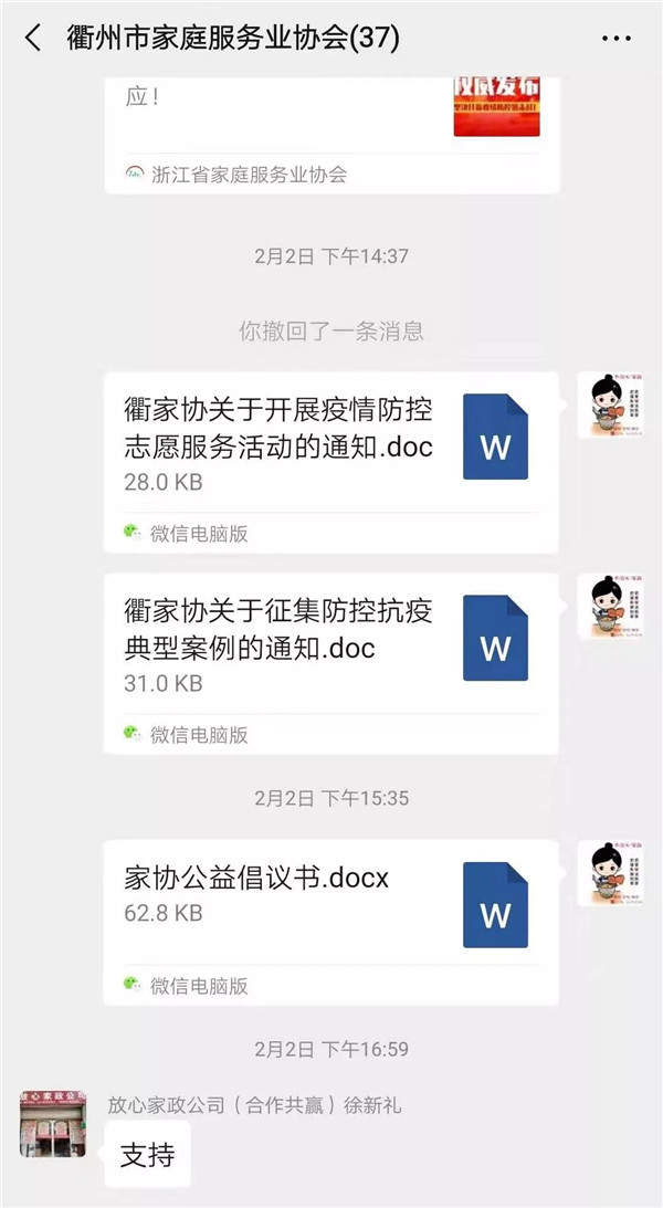 省家協(xié)副會長、衢州市家協(xié)會長單位,衢州半邊天家政服務(wù)有限公司第一時間采購大量的防護物資,及時發(fā)放,盡最大的努力保障在崗人員的身體健康,并對家政人員動態(tài)去向和健康狀況進行了解核實,嚴(yán)格篩查。羅姿會長表示從自身給行業(yè)做表率,堅守誠信,禁止任何服務(wù)收費漲價行為,積極與客戶溝通,妥善處理因疫情形成的業(yè)務(wù)調(diào)整,對客戶合理需求給予充分保障。衢州市家協(xié)也向全市企業(yè)和員工發(fā)出了《衢州市家庭服務(wù)業(yè)協(xié)會公益倡議書》以及《關(guān)于開展疫情防控志愿者服務(wù)活動的通知》,積極參與疫情防控。